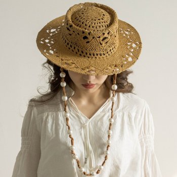 Elegant Wide Brim Straw Sun Hat for Women – Knitted with Pearls & Chain