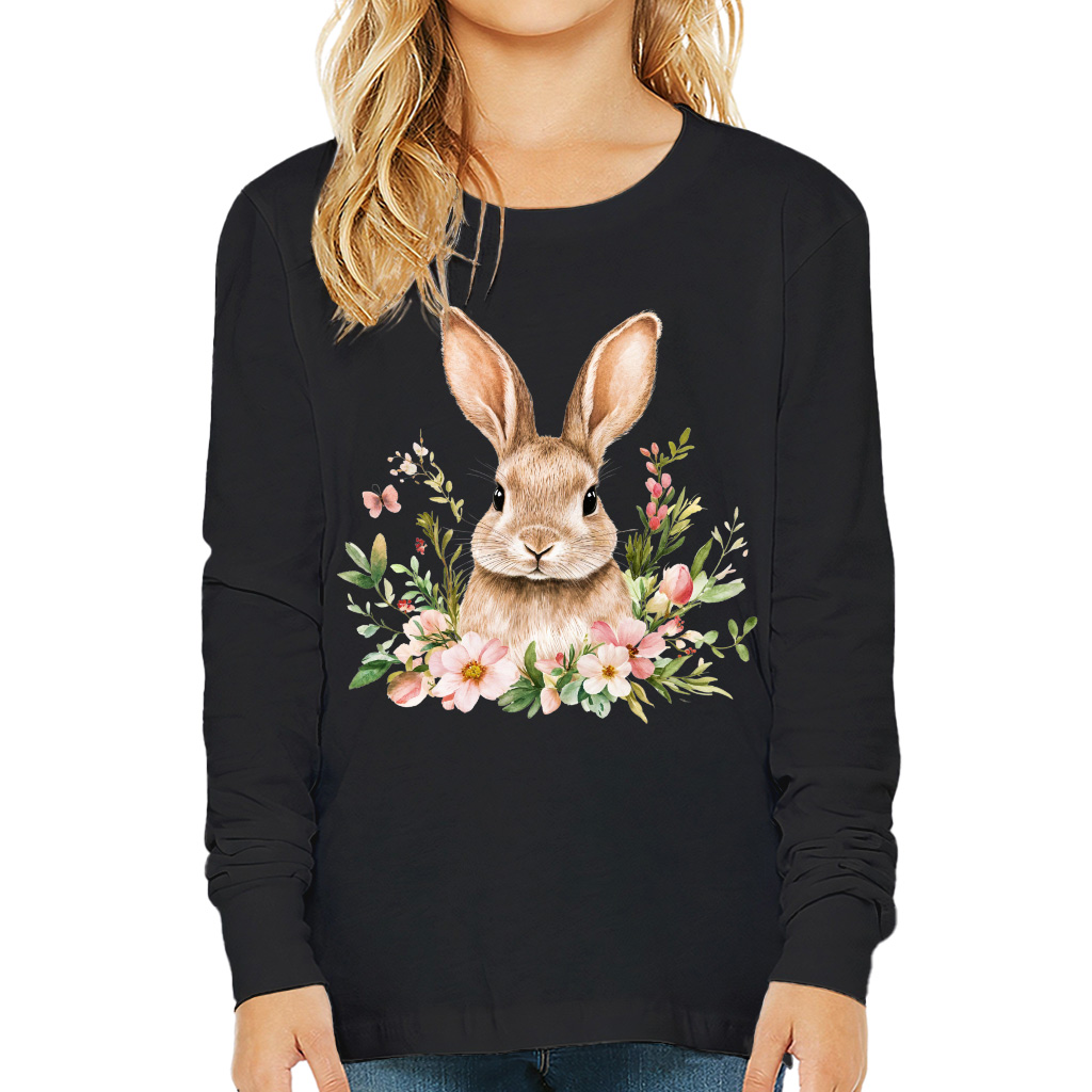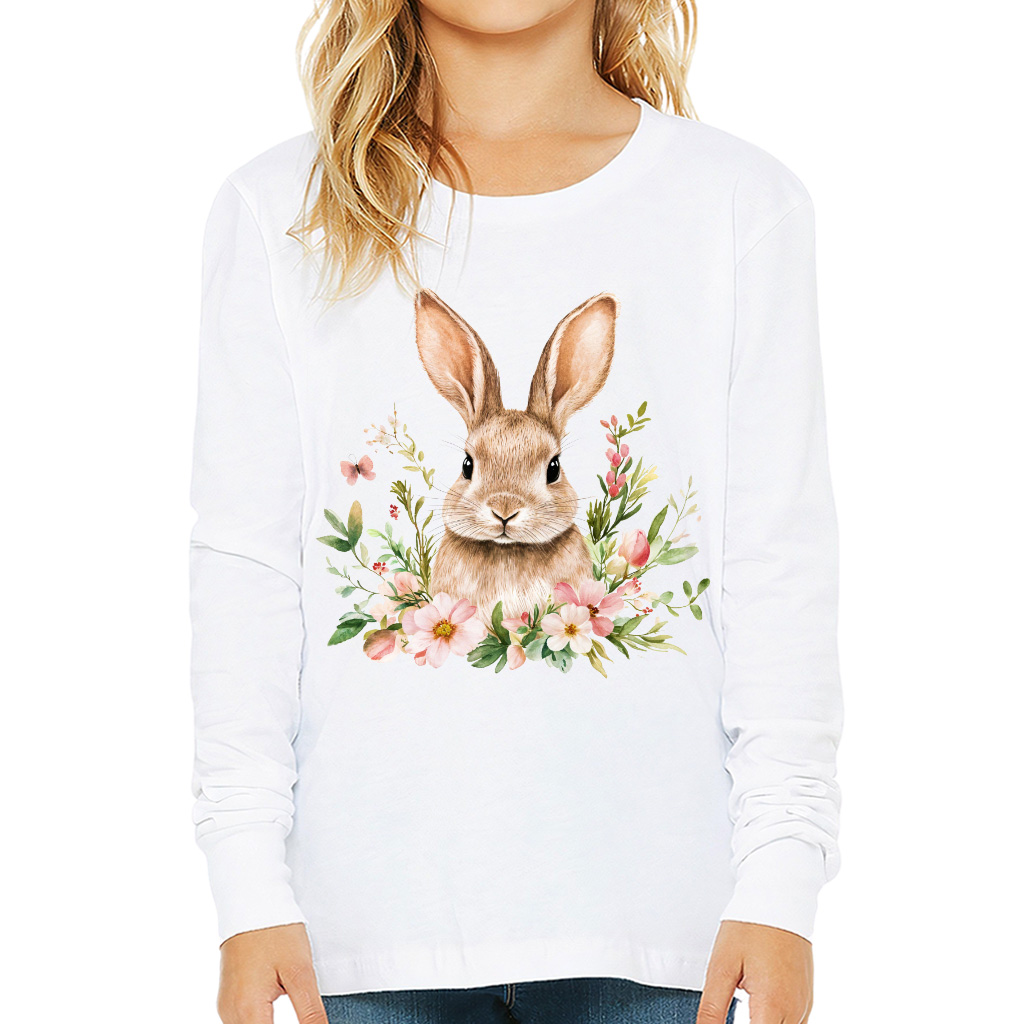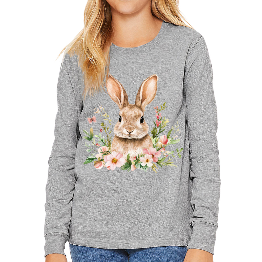 Floral Bunny Kids’ Long Sleeve T-Shirt – Spring Graphic T-Shirt for Kids – Trendy Bunny Tee for Boys Girls