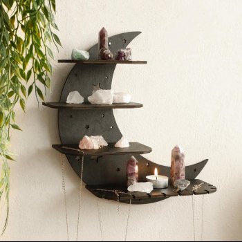 4-Tier Floating Moon Wall Shelf – Boho Rustic Wooden Shelf for Crystals & Aromatherapy