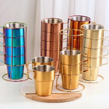 Stackable 304 Stainless Steel Double Wall Camping Mugs Set with Rack – 4pcs