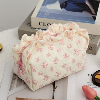 Cute Lace Bow Quilted Makeup Bag – Large Capacity Travel Cosmetic Pouch