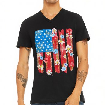 Floral American Flag V-Neck T-Shirt – Patriotic Graphic Basic T-Shirt – 4th Of July Tee